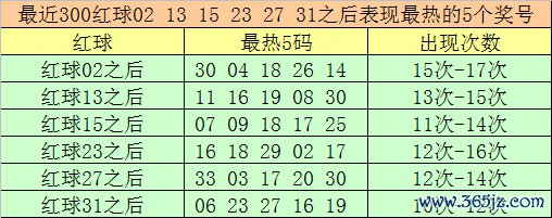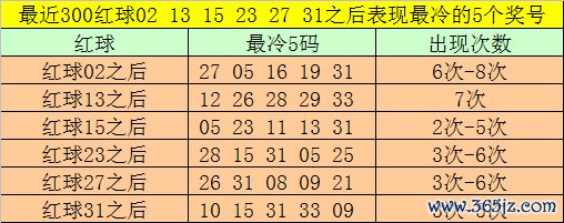 红球冷码统计:双色球第2025142期开出红球奖号区分为:02、13、15、23、27、31,在最近300期开奖中,各号码出现之后其下期出现最少的5个红球区分为: